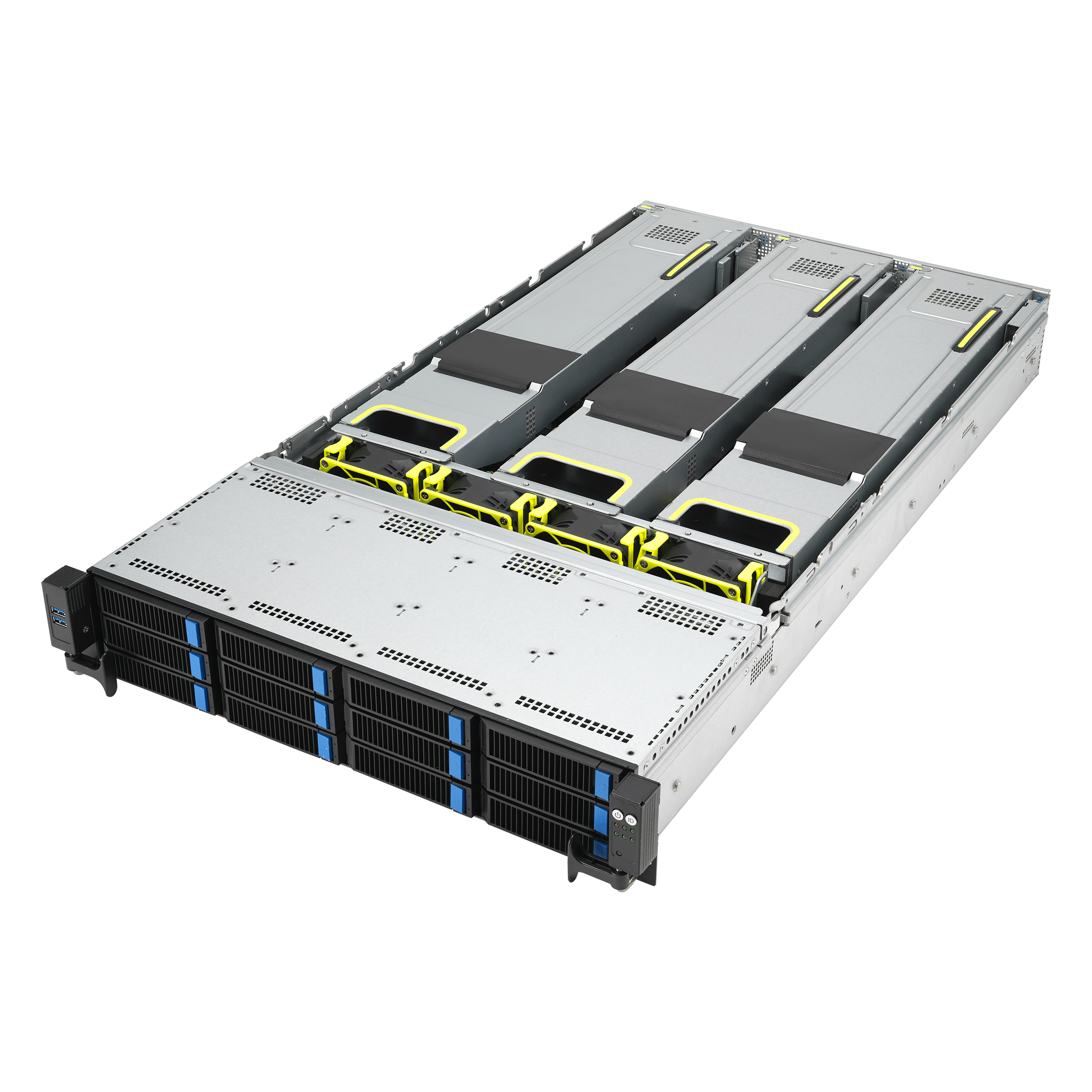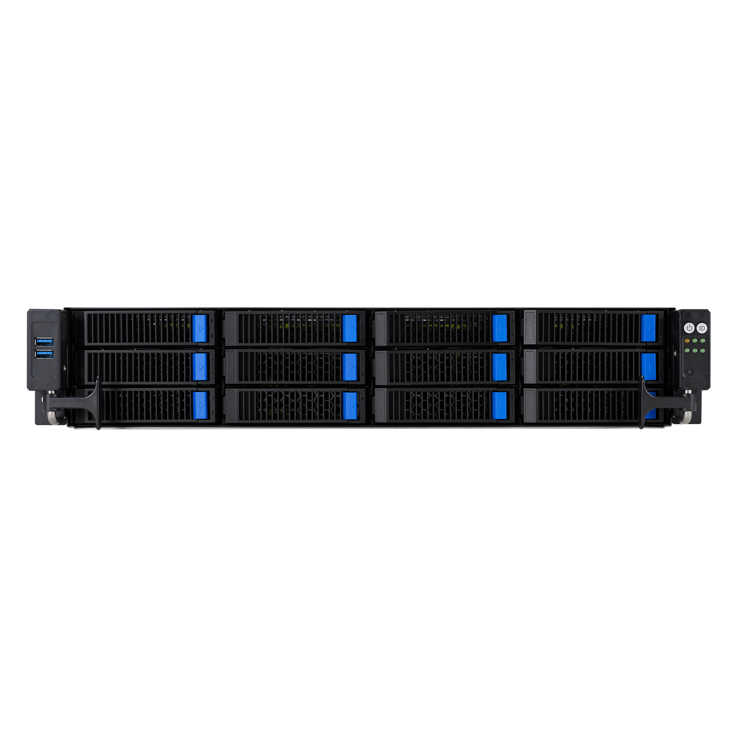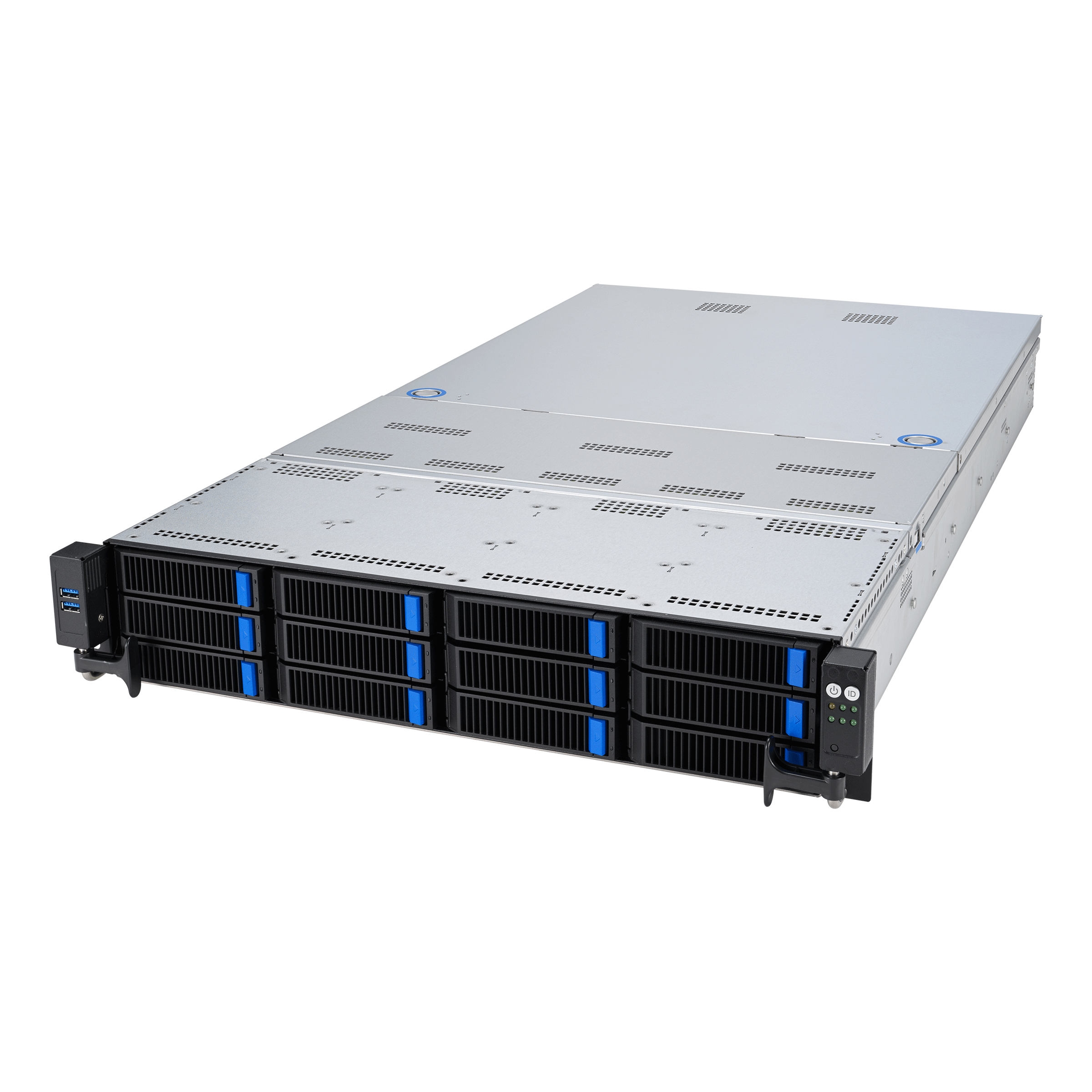 - 共 12 个存储托架可支持前面板 NVMe/SATA/SAS 驱动器,以提供大量存储设备及高传输性能
